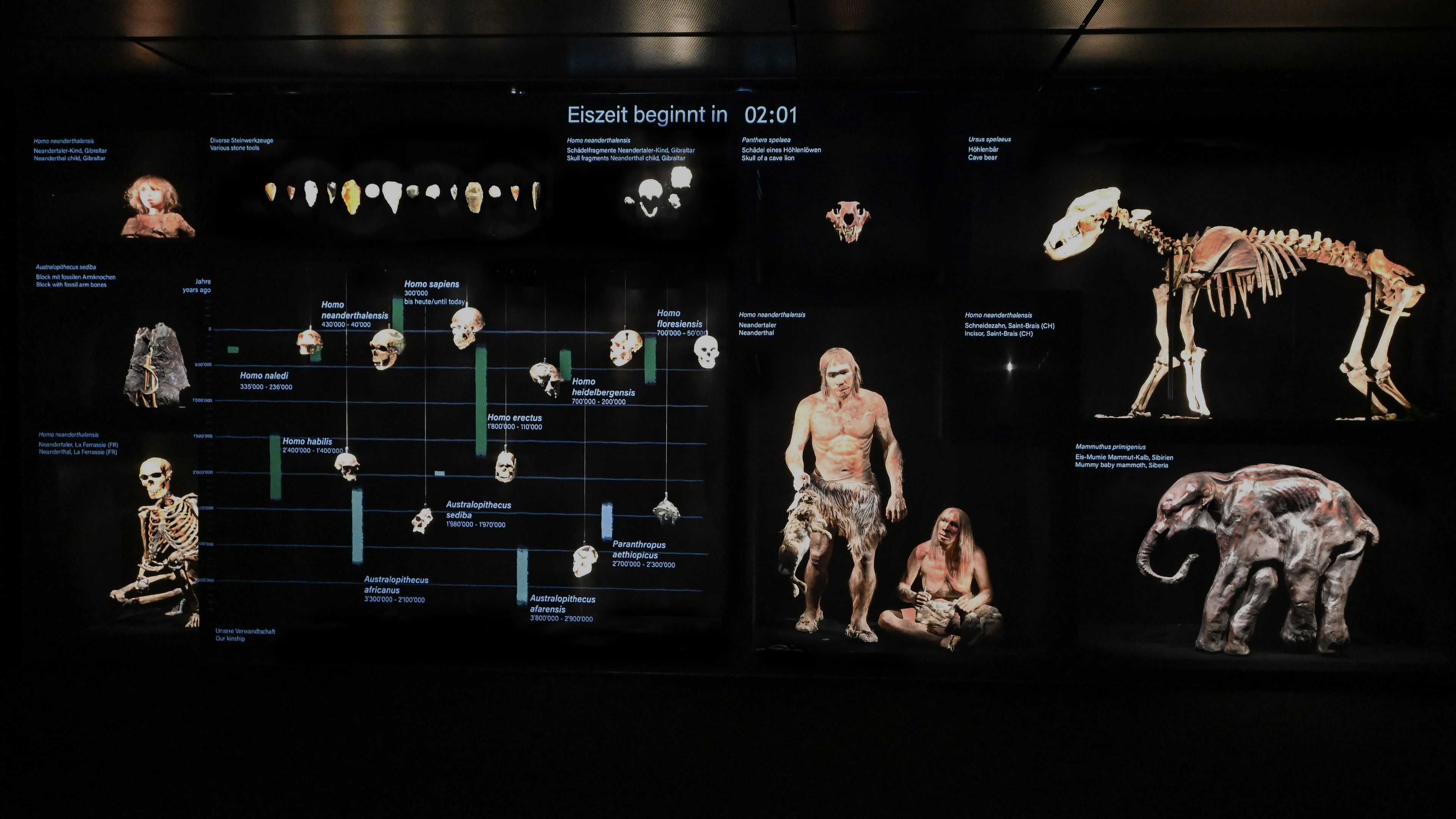 Die Themen Eiszeit, Neandertaler und unsere Verwandtschaft werden über einen grossen, inszenierten Schaukasten erzählt. Echte Knochen, Präparate und kinetische Schädel unserer Ahnen sind die Protagonisten. Über eine filmische Ebene werden die Elemente verknüpft, ihre Geschichte erzählt und aktuelle wissenschaftliche Erkenntnisse erklärt.