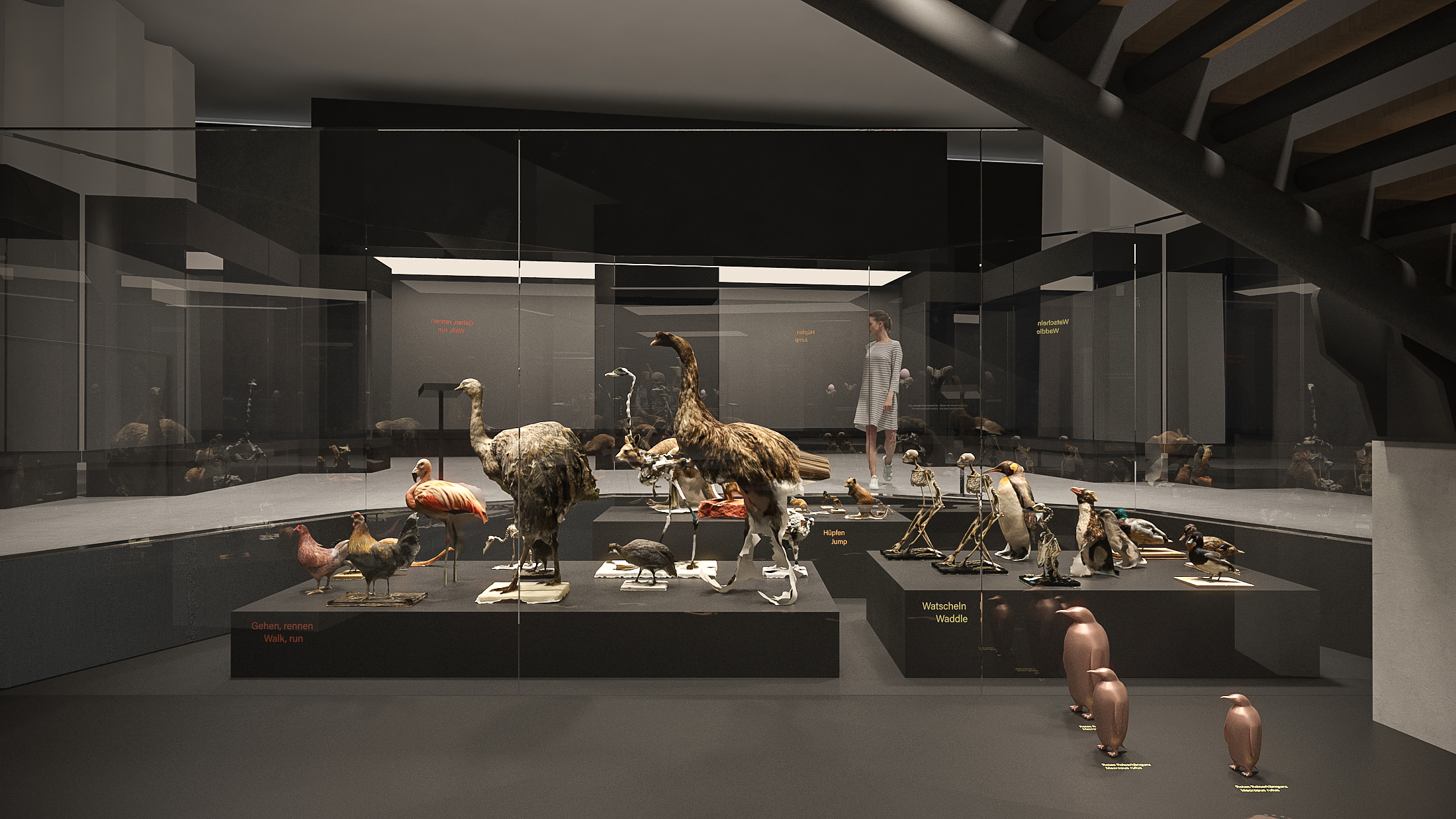 Unsere Vorfahren und tierische Vertreter auf zwei Beinen formen eine grosse Zweibeiner Karawane in den zentralen Vitrinen. Alle bewegen sich in dieselbe Richtung.
